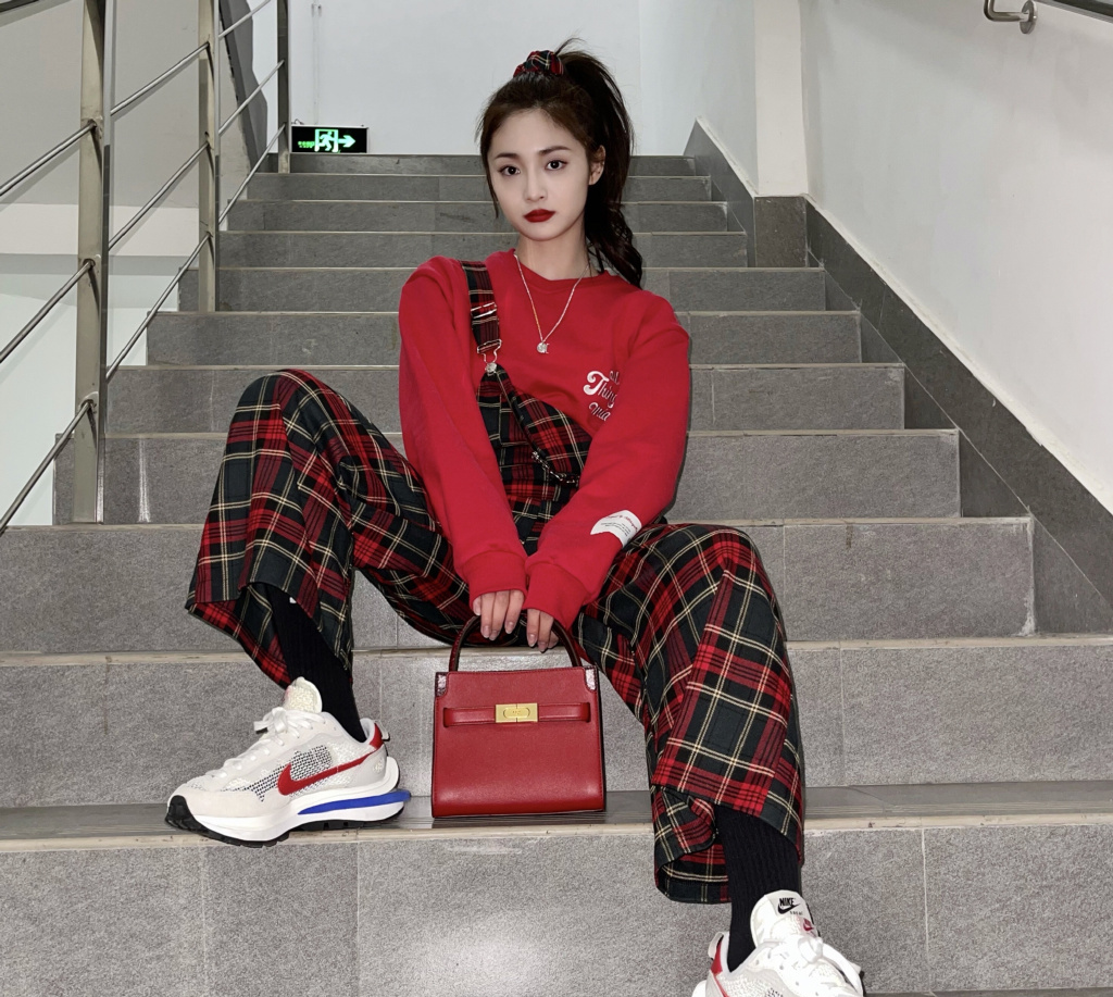 毕竟冬天嘛,咱们还是要注意保暖的,大家可以像周洁琼这样,用正红色卫衣+黑红格子的背带裤,整一身就real减龄~
