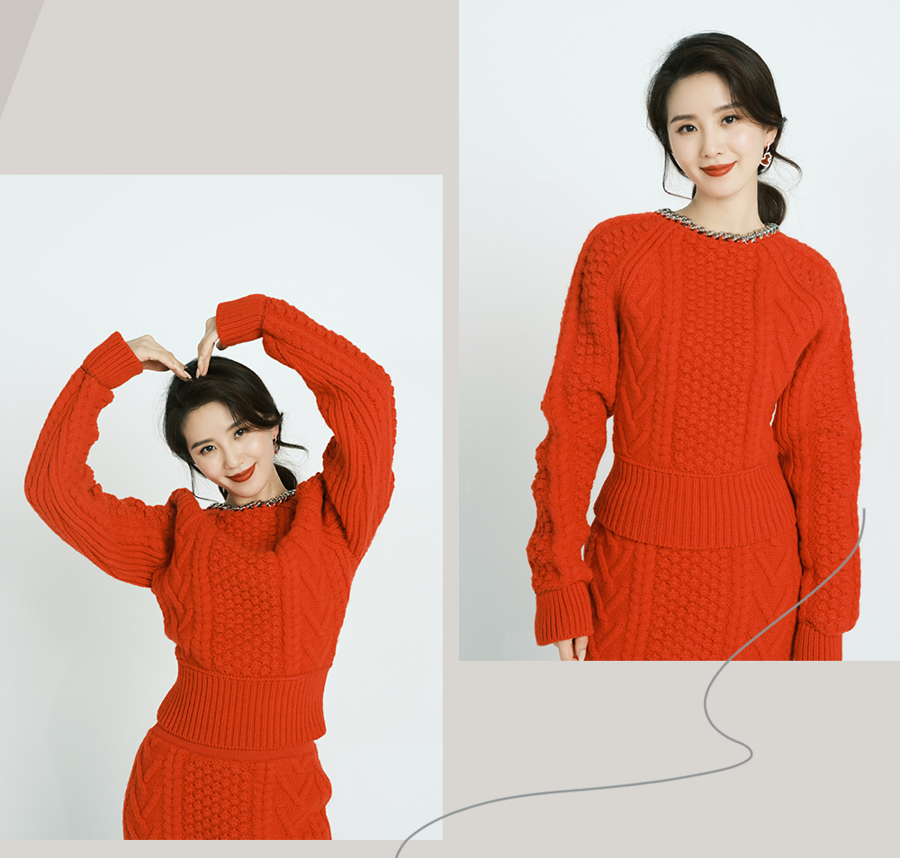 粗线红毛衣的套装温婉知性,上衣收腰的版型可以突出腰线,不显臃肿,再用银色项链装点,一下子就时髦起来了~
