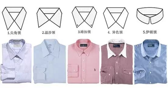 一些常见的衬衫款式和衬衫领样式正装衬衫的领形开领领尖的距离从3.5英寸至6英寸的之间领型开度大点的又叫做温莎领或切角领尖角领领尖的距离从2.5英寸至3.25英寸之间的领型扣角领领尖位置有纽扣这种领型为当时的马术运动员设计为防止在衬衫领角被风吹起一直以来被认定为运动或休闲领型所以正式场合上不宜穿着注:衬衫领型可很据个人喜好和脸型来选择,切忌选择扣角领,一些时尚的小角领,撞色领等也不适用于正装搭配。以下是整理出来的一些常见的正装衬衫上领型