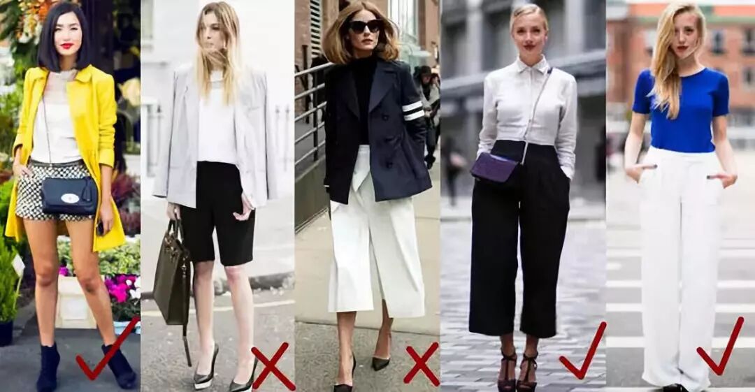 从上面这张图可以很直观的看出来,九分裤和短裤都是适合小个子女生的。七分裤和五分裤千万不要尝试,没有高个子的大长腿,恐怕很难穿出它的气场。