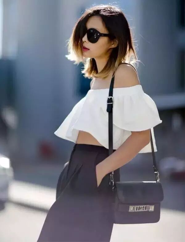 露肤度较高的吊带上衣是非常适合微胖姑娘的,锁骨、胸口和整个肩膀都露出来,上臂的围度就变得容易忽视了。吊带越细、露肤度越高的吊带装显瘦效果越好。