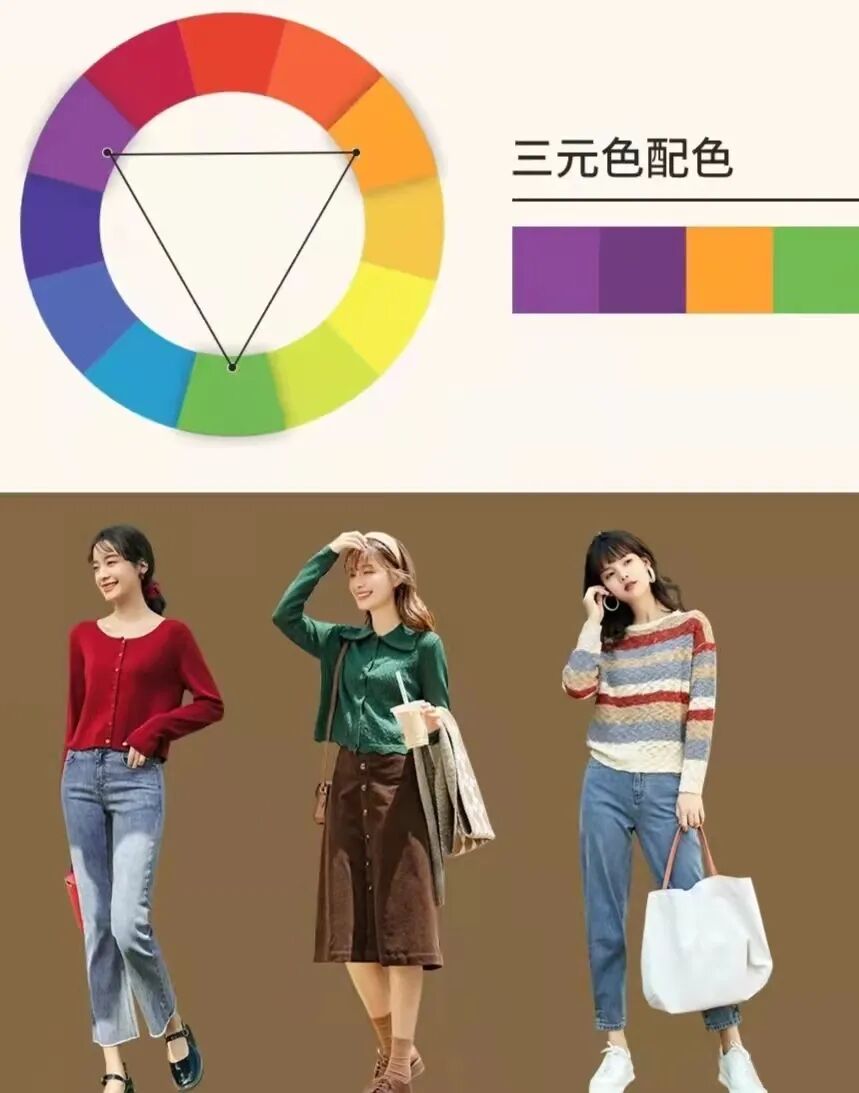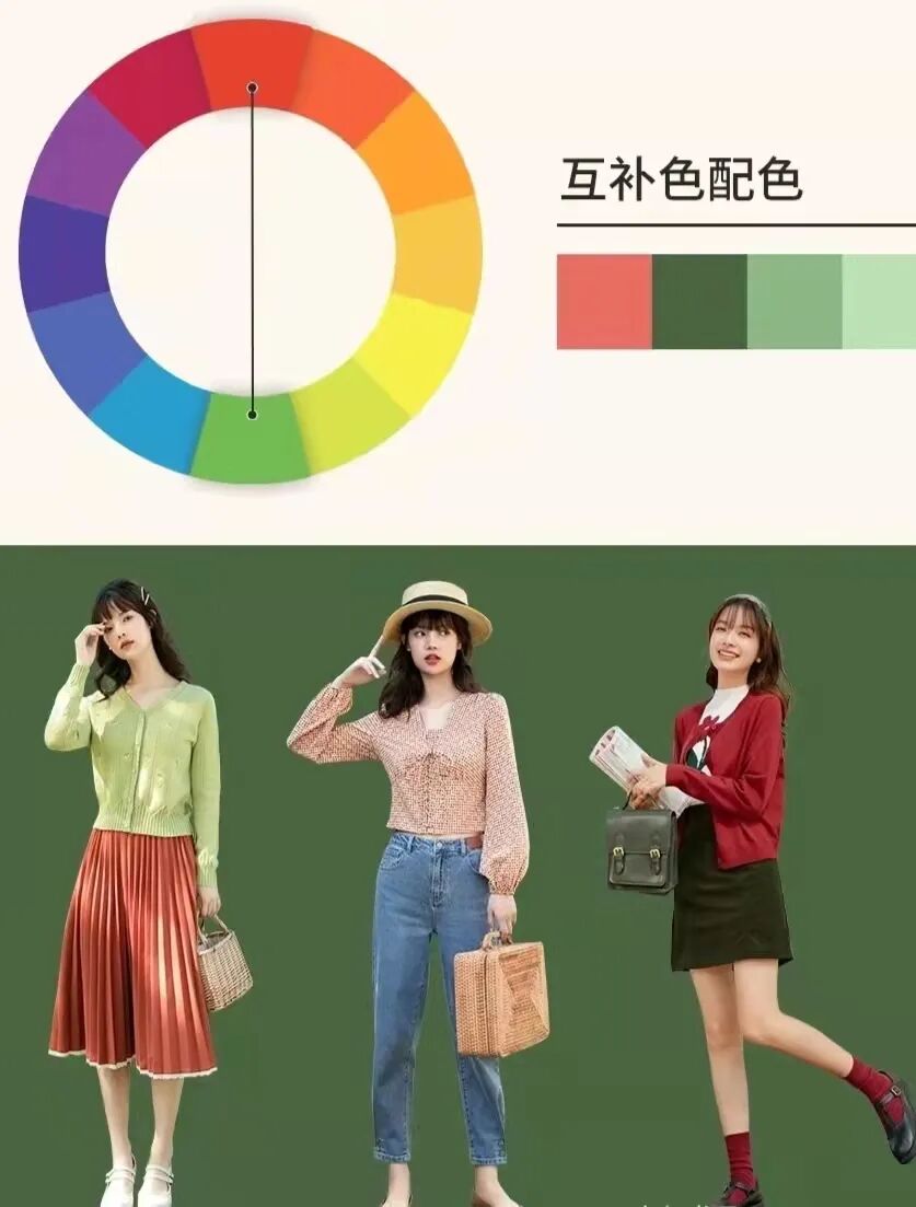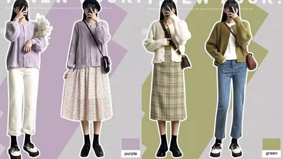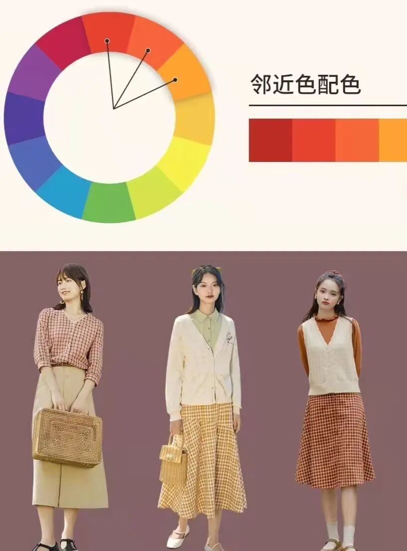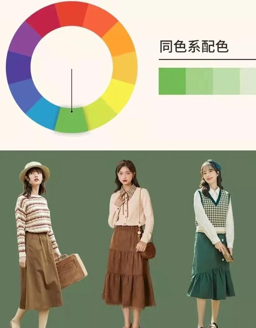 搭配时切记颜色种类不能过多,应尽量控制在三种及三种以下。否则全身颜色过多会给人视觉上的混乱感。同类色系搭配,选择明暗交错的颜色进行搭配也很出彩~