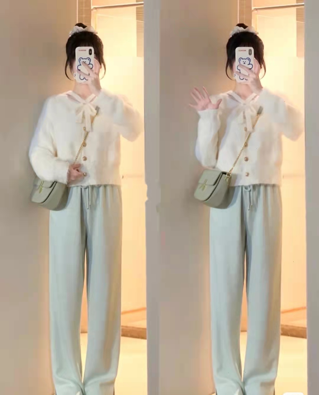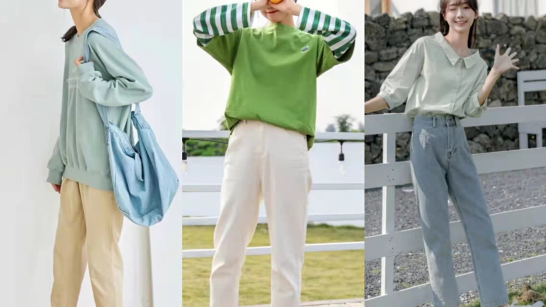 小面积白色配其他色,如下图中上半身白色,下半身搭配一条卡其色的高腰裤子,落落大方,让你看上去更有温度。同样,生机的绿色携来春天的风,白色+绿色的搭配,更有春天生机勃勃的样子。