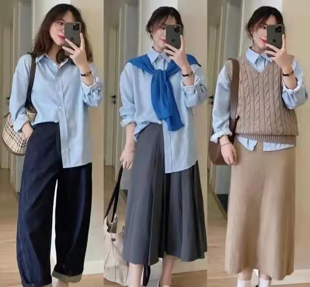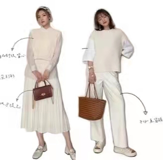 基础款的圆领或V字领毛衣非常适合叠穿,可以尝试同色系叠穿,比如白色毛衣与白色衬衫叠穿,协调统一,又可以打造出层次感,显得格外高级。