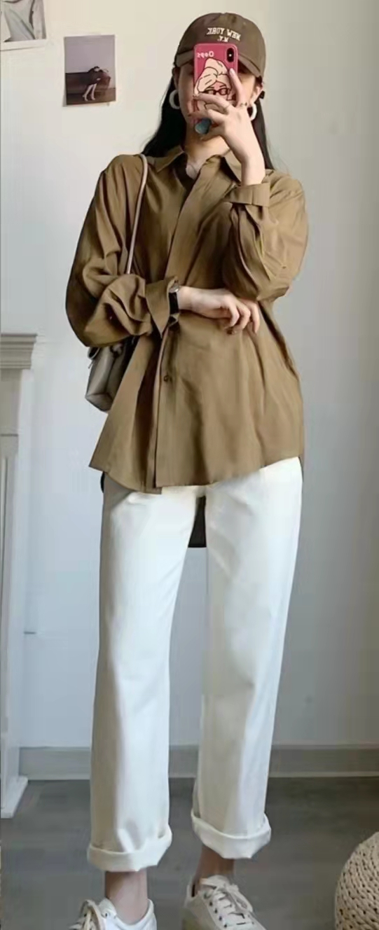 一条略带宽松的牛仔裤和运动鞋,天微凉搭配一件同色系的衬衫外套,恰到好处。