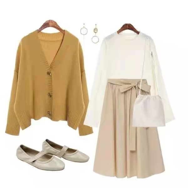 毛衣开衫作为搭配点缀,披在连衣裙外面或者毛衣外面,装点造型、丰富搭配层次。