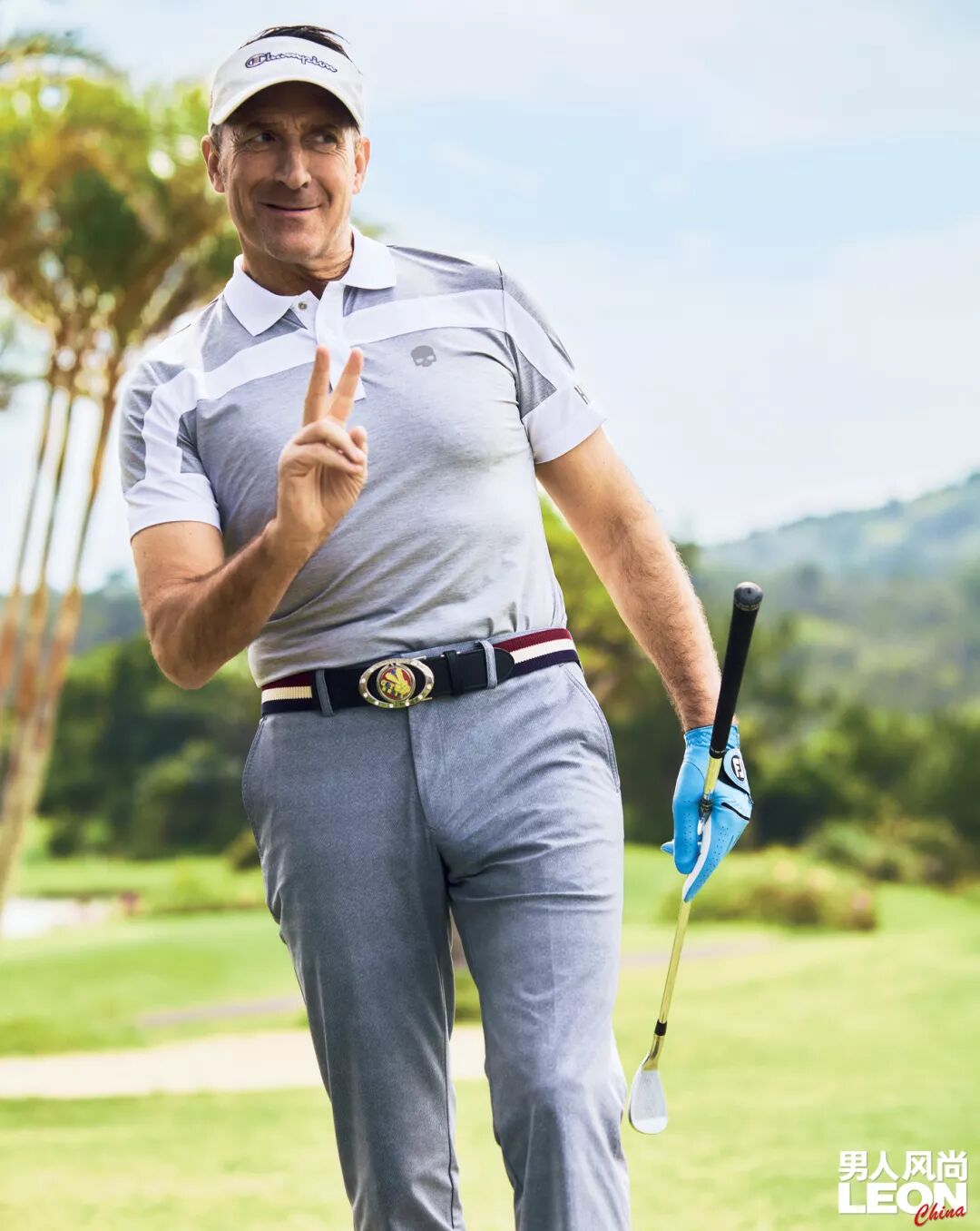 皮带 约605元、位置标志 约73元/均为 Winwinstyle、POLO 衫 约1150元 /HYDROGEN、 裤子 约1211元/Munsingwear、遮阳帽 约194元/ Champion、手套 约109元 /FootJoy