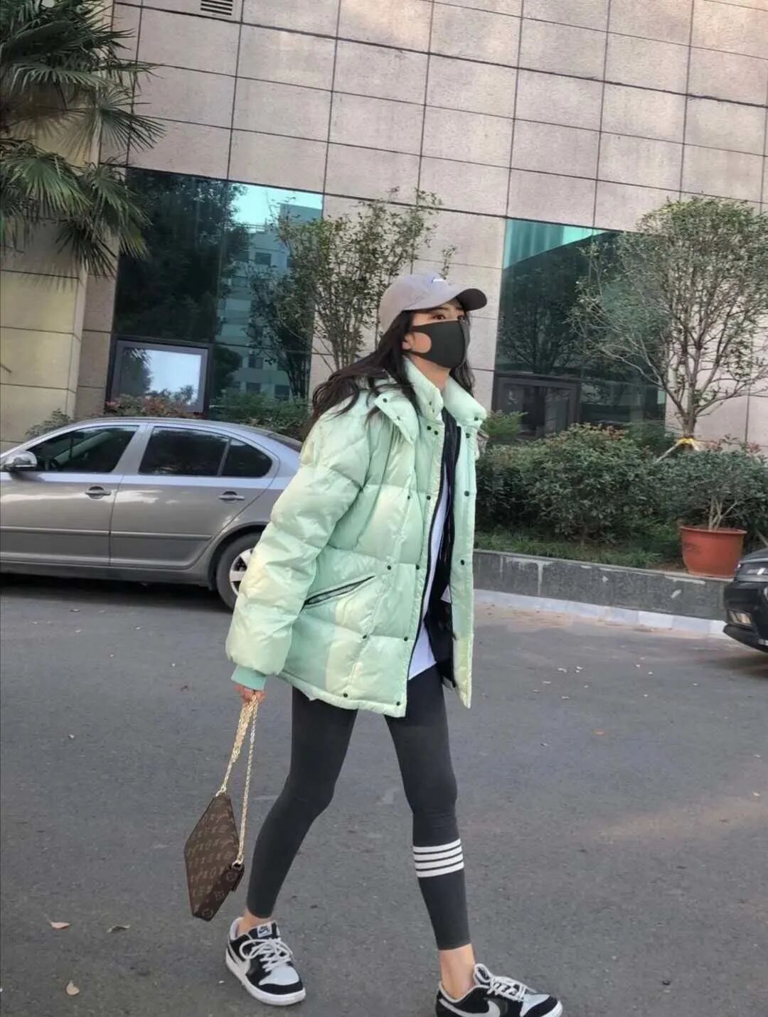 这白色的羽绒服颜值也太高了,终于也有新款蒙口羽绒服啦,薄荷绿好清新的颜色哦,而且穿上超级显白,无敌暖和的!冬天里面一件白色T恤就够啦,是在是太好看了,下身是TB条纹打底裤,加绒款式,秋冬穿没有问题,显腿瘦和腿型好。
