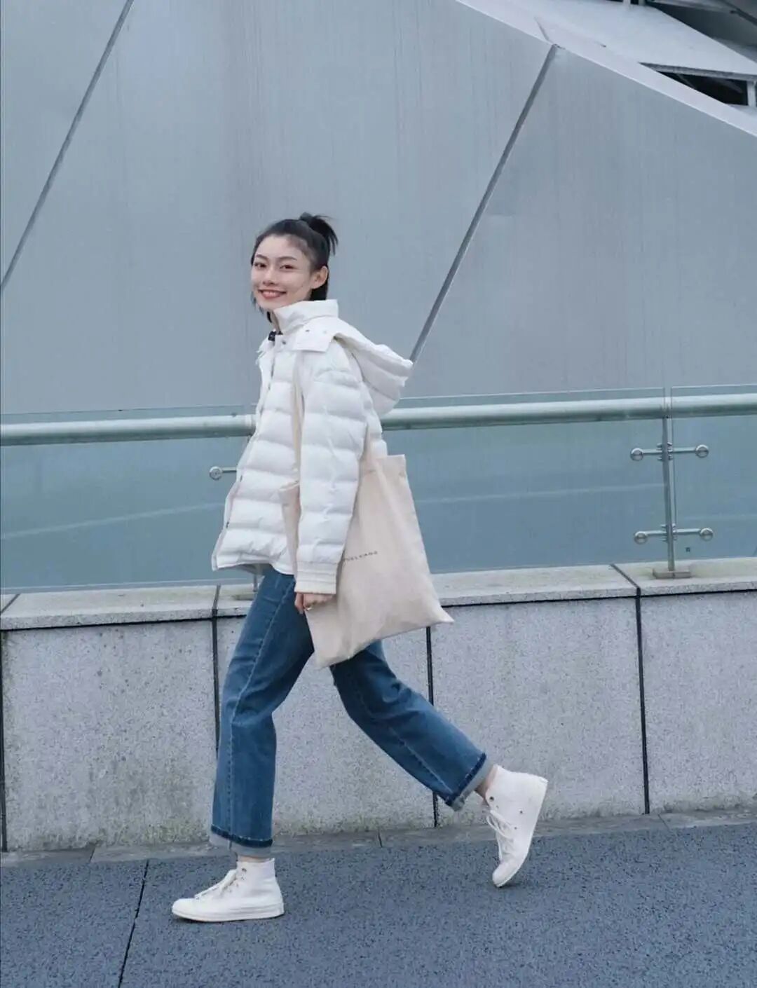 步入冬天怎么能少了白色的羽绒服,白色羽绒服只要搭配的号也一样好看,这件白色羽绒服上身很舒服,内搭是一件简单的打底衫,裤子选择了九分的直筒廓形蓝色牛仔裤,挽起裤腿搭配白色的匡威鞋更显活力。