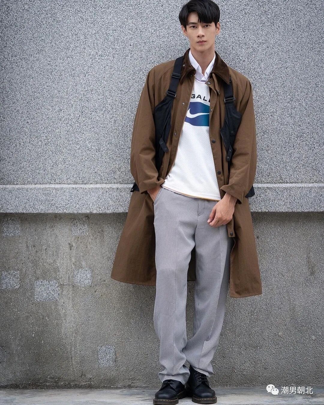 搭配示范:白色衬衫+米色卫衣+卡其色大衣+灰色休闲裤。由内而外的颜色渐变,让整体穿搭显得很有层次感,同时也让整套搭配潮范儿十足,很值得小哥哥们学习哦!