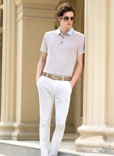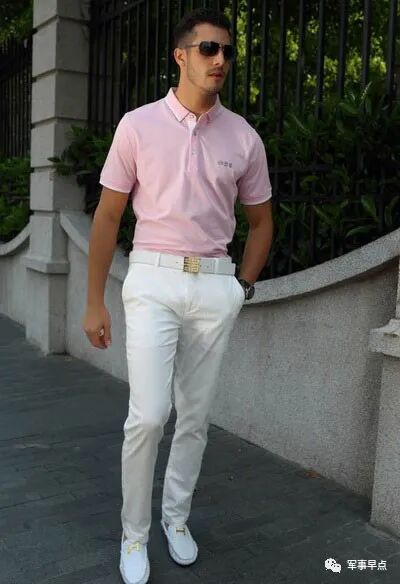 四:一件粉色的休闲短袖搭配上一条白色休闲小脚裤,再有眼镜和手表的搭配,这样的搭配立刻让你年轻十岁,这样的搭配很多成熟男人在休闲的时候穿的比较多。