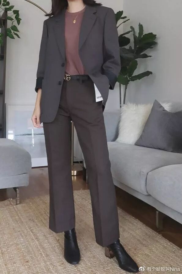 结合工作性质,体制内女性可以选择顺色系、百搭色、大地色。顺色系:全身可以选择一个色系,注意要有深有浅,才能体现层次感。下面给大家放一个我很喜欢的博主穿搭照,仅供参考。(以下图片均选自微博:有个姑娘叫Nina)2