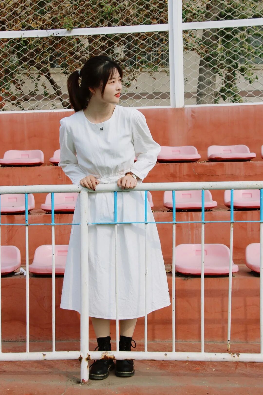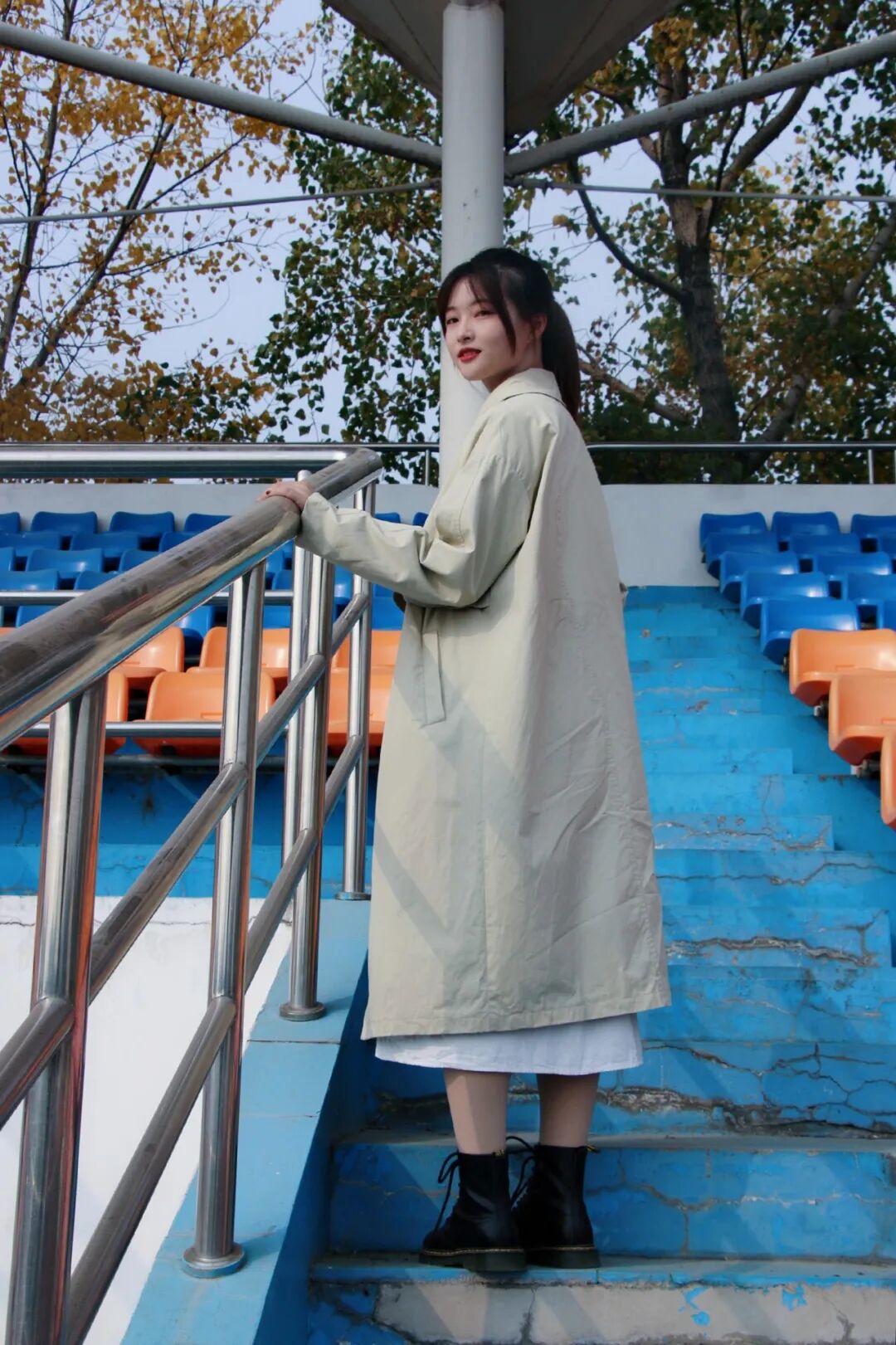 02温柔知性风米色风衣搭配白色长裙,再踩上一双酷炫马丁靴。脖颈间佩戴的黑色天鹅项链,给这份温柔增添一抹神秘的色彩,最后扎起干净利落的高马尾,谁说御姐和温柔不能并存!