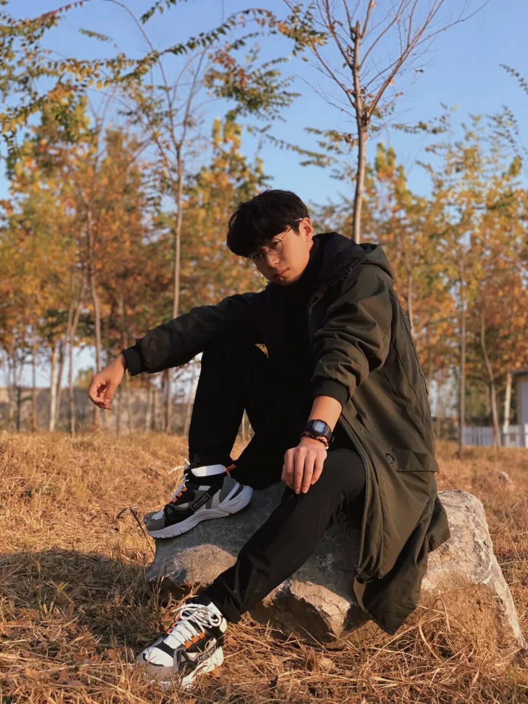 06 成熟极简风当军绿色长款外套搭配黑色高领毛衣,穿上一双舒适的运动鞋,手腕上佩戴的手表与珠串,给小枣仁增添了几分成熟的气息!