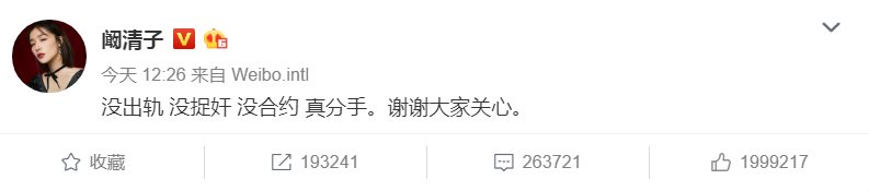 阚清子发朋友圈承认分手:我的青春喂了狗。