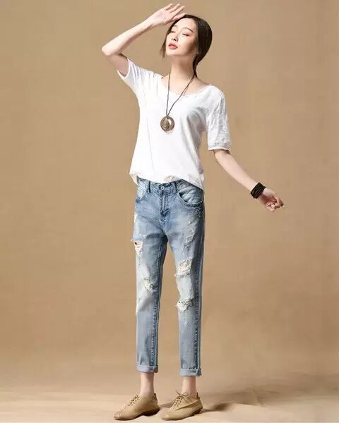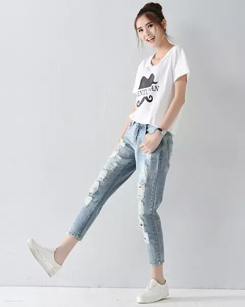 牛仔裤的破洞最好不要太大,太破,有那么一种破旧复古的感觉就好了。