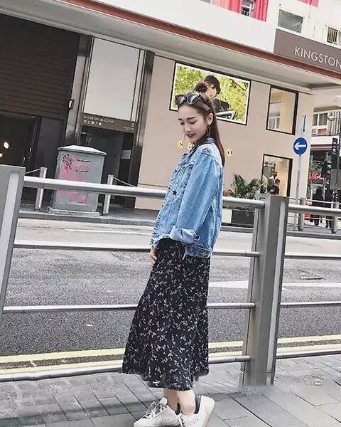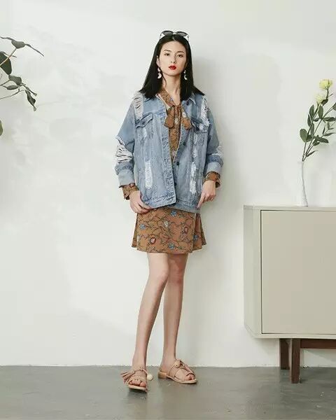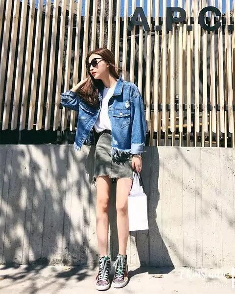 破洞牛仔外套 + 裙装