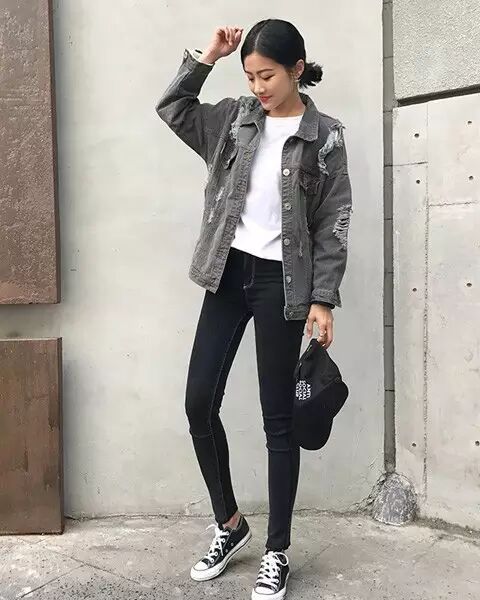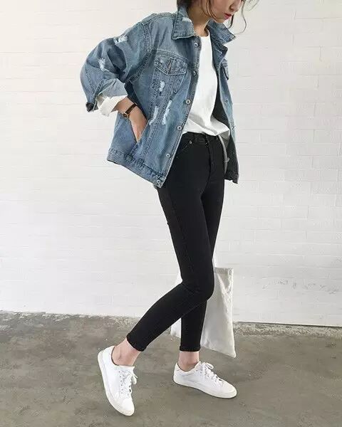 永不过时的搭配,突出个性,彰显时尚,裤子搭以黑色,既能够突显身材,也能对腿部有拉长的既视感,既能衬托外套特点,又能显腿瘦,鞋子配以运动鞋或者板鞋、帆布鞋为宜。