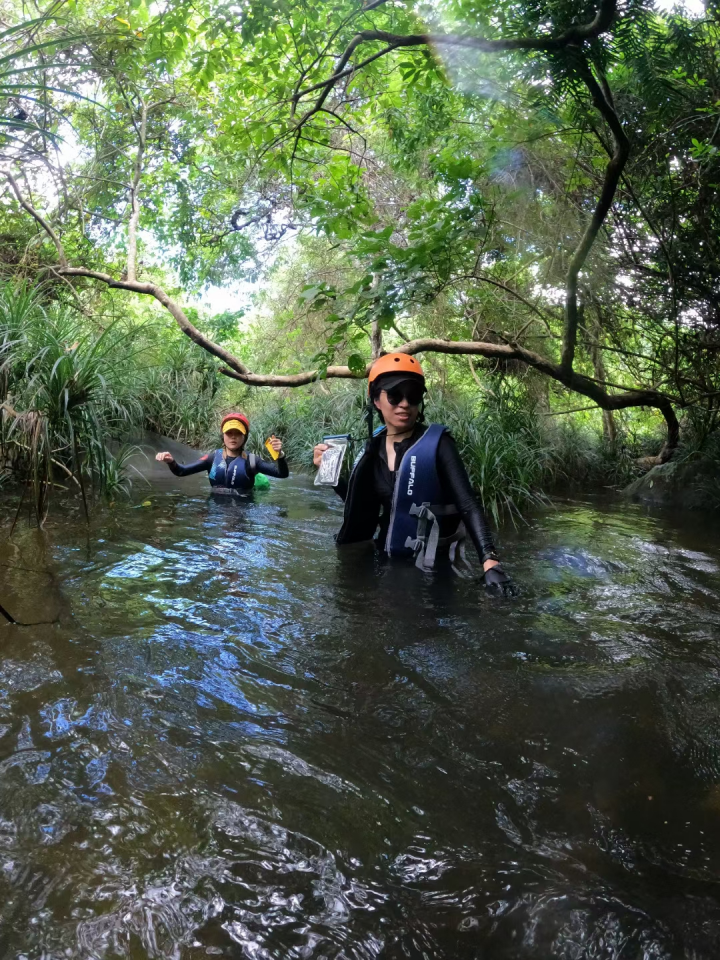 溯溪的核心是逆着水流方向克服地形障碍来实现登山探索,相比常规的登山更具冒险性和挑战性。传统的溯溪运动对参与者有着较高的专业和体能要求。街头极限运动挑战博主BOSS海洋对此深有体会,他对懒熊体育说,绳索攀岩、瀑降是溯溪的灵魂,而这两项运动既是技术活,又很考量身体能力支配。“水往胸口滑的感觉很舒服!”海洋对2019年的几次溯溪记忆犹新,他说,当时他加入的是一个小群体的溯溪俱乐部,每人300多元,有领队和教练,教练先打点,到熟悉的地方,避免危险,新手要从学绳索开始。如今,各种经过演变的溯溪,愈发成为不同年龄段户外人群的心头好,这也吸引着很多户外俱乐部瞄准溯溪。玩户外12年的白辰,在新疆、云南做过爬雪山、滑雪的生意,经营冲浪俱乐部四年之久,之后玩了三年的溯溪。专攻溯溪的山合海户外俱乐部,最大的卖点在于海南热带原始深林里的原生态路线。因线路较复杂且水路相对较多,玩家们常常可体会到水没到腰部甚至腹部胃部位置的长距离水中徒步。整体挑战下来,极具新鲜感与挑战性,且更加亲密地接触大自然。▲白辰供图。