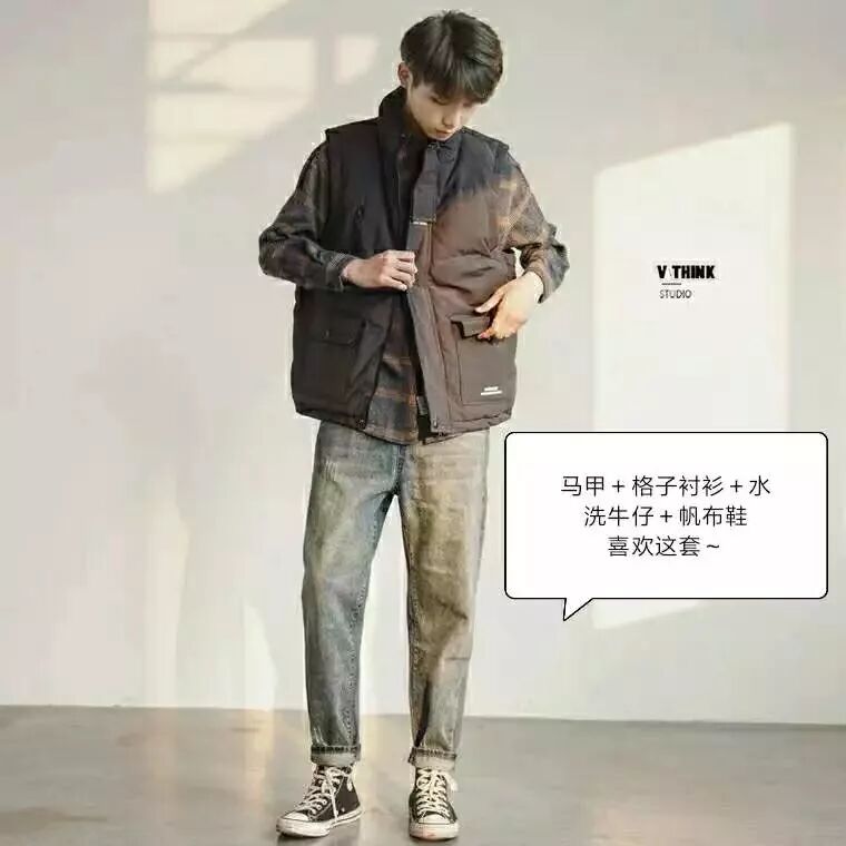 格子衫+外套+休闲裤+帆布鞋