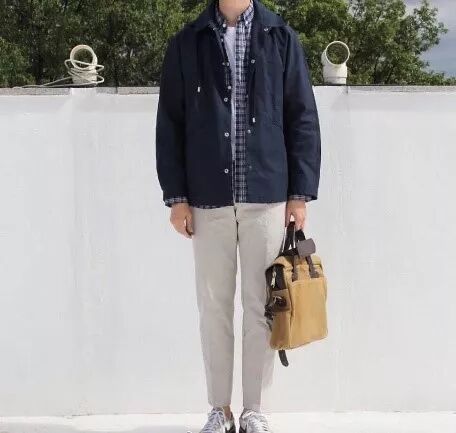 “型男搭配~天凉了可以里面穿件短袖,格子衬衫,外面加外套,或者可以直接穿格子衬衫加外套,下身配一条休闲地裤子(个人建议不要轻易尝试白色的裤子,穿不好就是悲剧现场啦),鞋子穿一双板鞋就可以啦!推荐理由:有点小成熟风格,让人觉得稳重!”