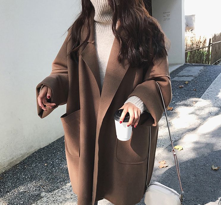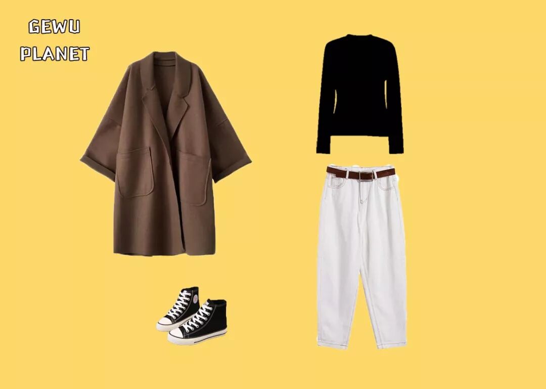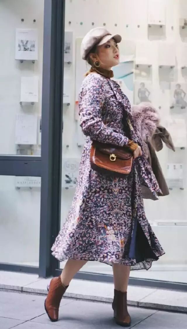 试问哪一个女孩子的衣柜里可以缺少一件呢子大衣呢?选择版型比较宽松的纯色大衣,百搭的棕色,细长型的翻领,从视觉上进行了纵向拉伸,可以遮挡身材的不足,显高又显瘦~
