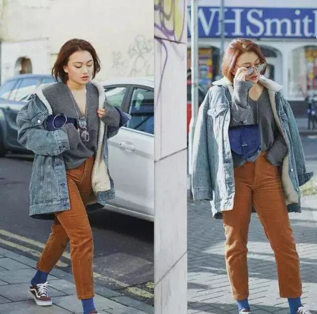 永不过时的牛仔外套搭配V领毛衣与阔腿裤,甜美之中又带了一点点酷酷的感觉。可以的话,还可以配上与毛衣同色系的的帽子,让穿搭更有层次感。