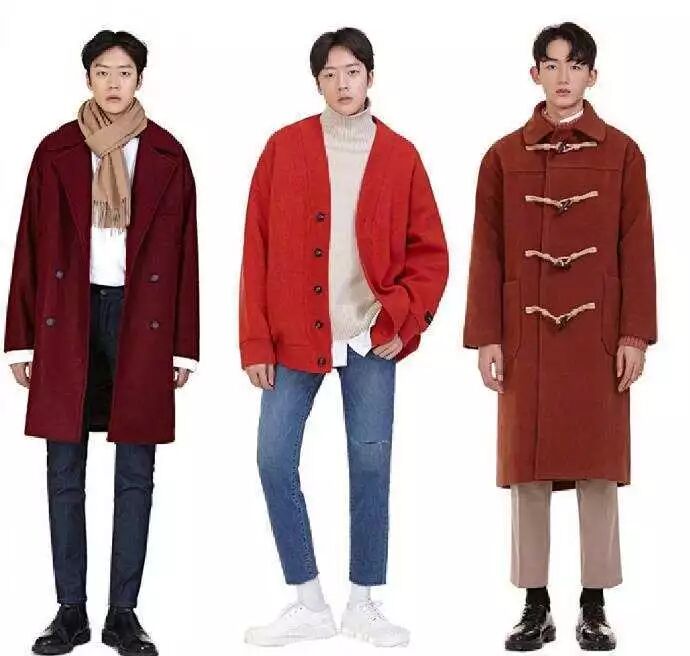 酒红色的毛呢大衣有点点成熟,所以搭配白色的打底衫会更显年轻一点,也比较适合下雪的圣诞节~浅杏色的毛衣搭配红色开衫,给人一种暖男的即视感。红棕色的牛角扣大衣充满了学院风,搭配卡其色的直筒裤很显时尚。