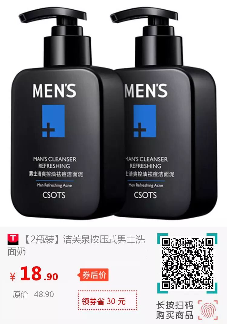 小红书推荐!双11当天,爆卖19W件的,洁芙泉男士洗面奶!只要5.1啦!男生也是要注重清洁~不然脸上毛孔大,黑头多,严重影响颜值!这款控油去痘,洗完搭配同款保湿爽肤水!让皮肤干净清爽,还滑滑的呢!