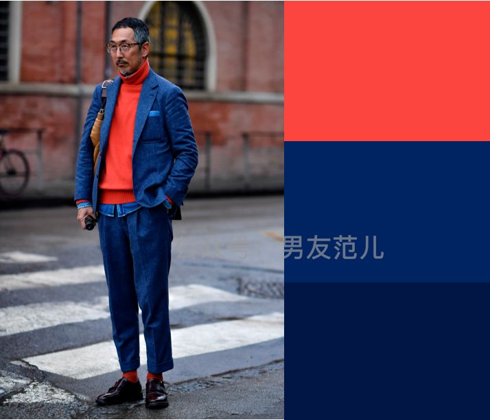 牛仔蓝也适合与红/橙/黄撞色,但要降低双方的纯度或明度。下面土橙色+牛仔蓝,明度就把握得很好。选了偏棕的橙色,而非荧光亮橙色: