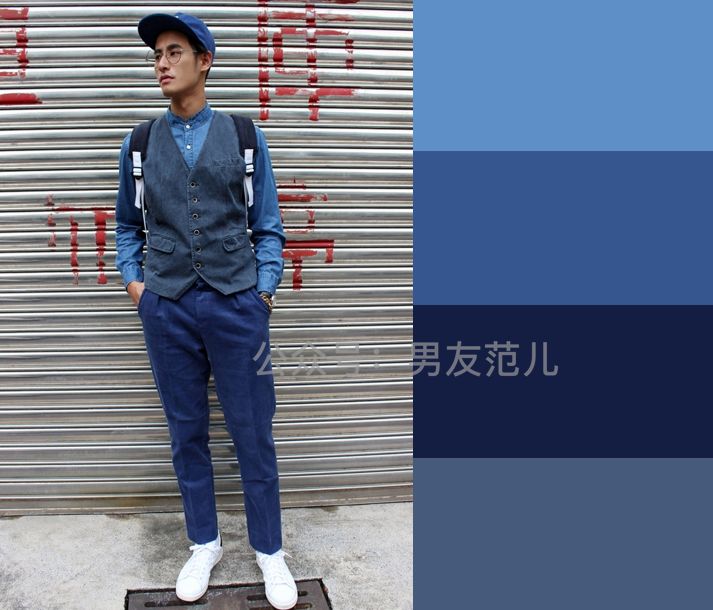 夏天很适合蓝色的同类色搭配,视觉上会很清爽。特别是藏蓝和牛仔蓝的搭配,把握好深浅的落差,基本不会出错。