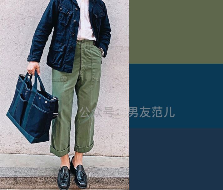 这套的军绿色工装衬衫是个亮点,其实就可以用上面提到的思路,卡其+军绿或藏蓝+军绿,并且鞋子与内搭呼应。