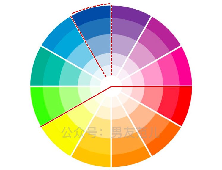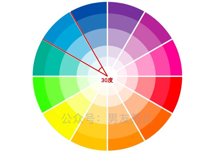 在12色相环上,30度夹角以内就是同类色: