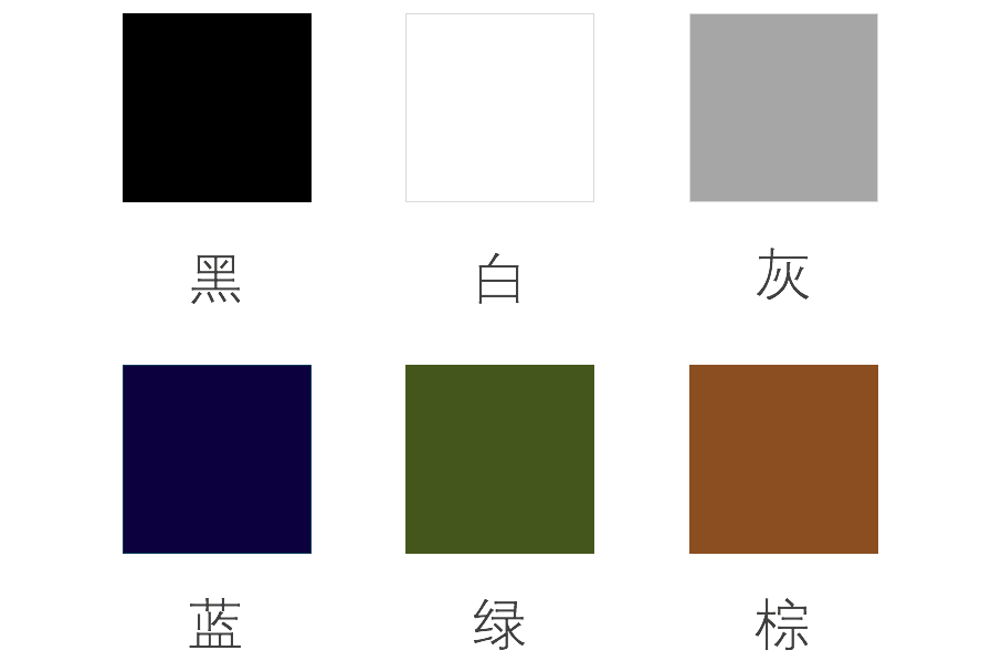 首先是基础色,有黑、灰、白这种无彩色,还有蓝、绿、棕这几个有彩色。