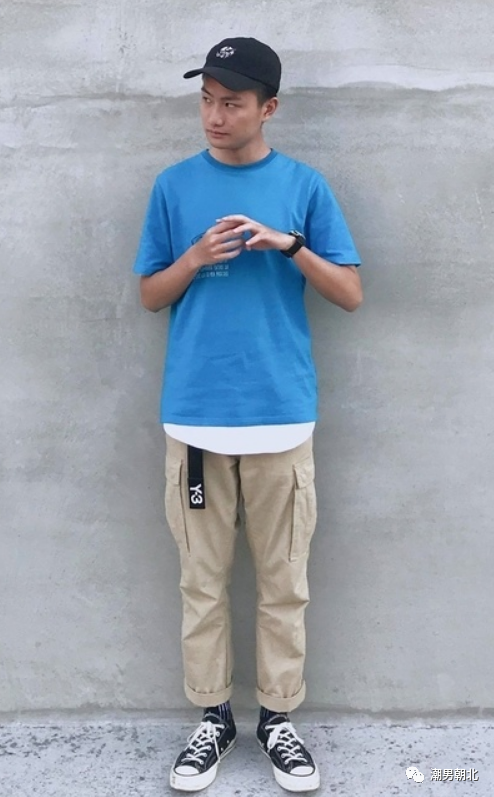 矮个子男生给人的感觉是非常年轻有范儿的,因此衣服的颜色可以选择得更加活泼一些。比如男生最喜欢的蓝色,我们可以选择蓝色的T恤,下半身再搭配一条卡其色工装裤,看起来特别舒服,很时尚帅气。