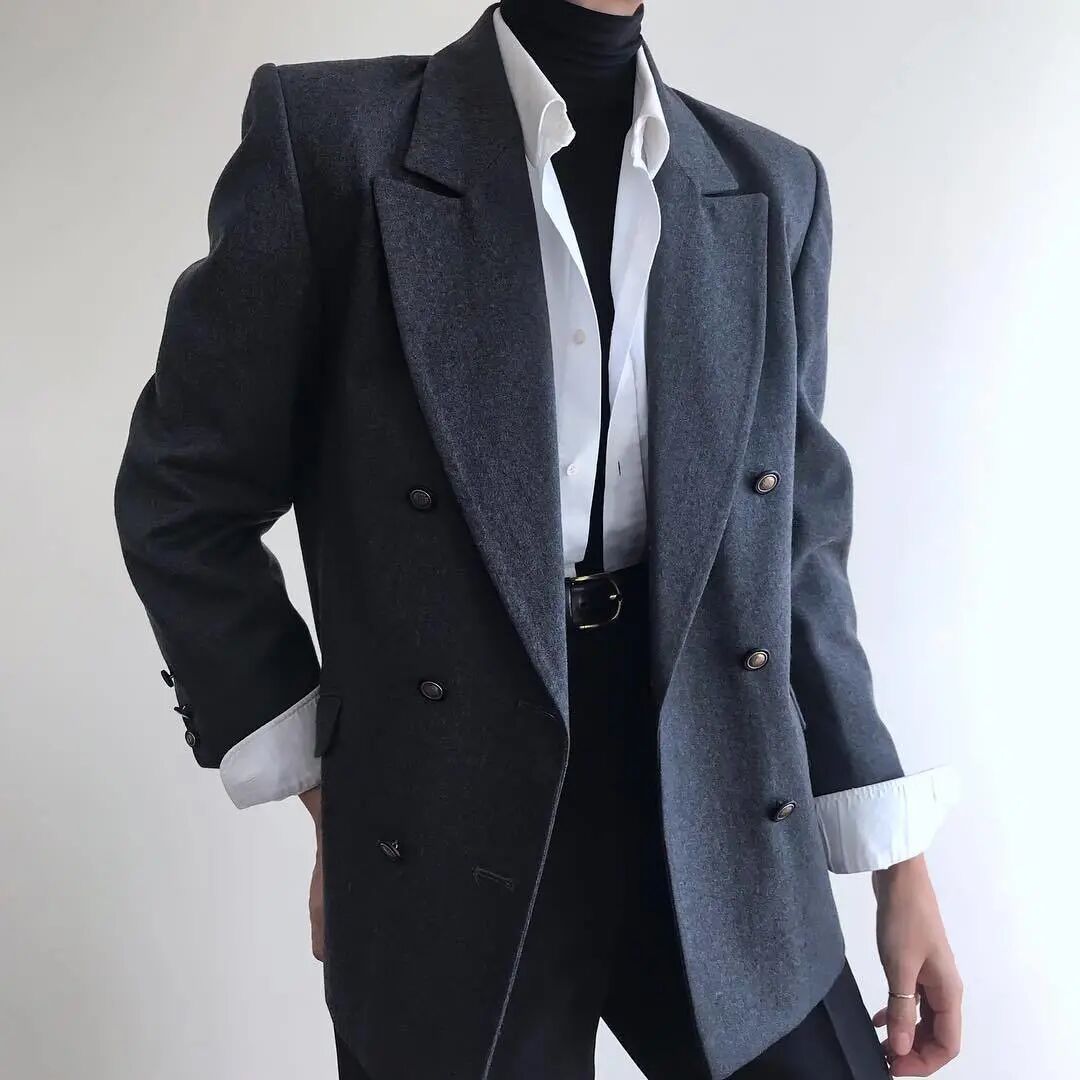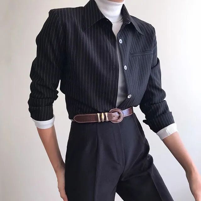 在里面搭配一件高领内搭,衬衣不用扣那么上面,大面积露出内搭。下面搭配休闲裤或者牛仔裤,真的无比帅气!