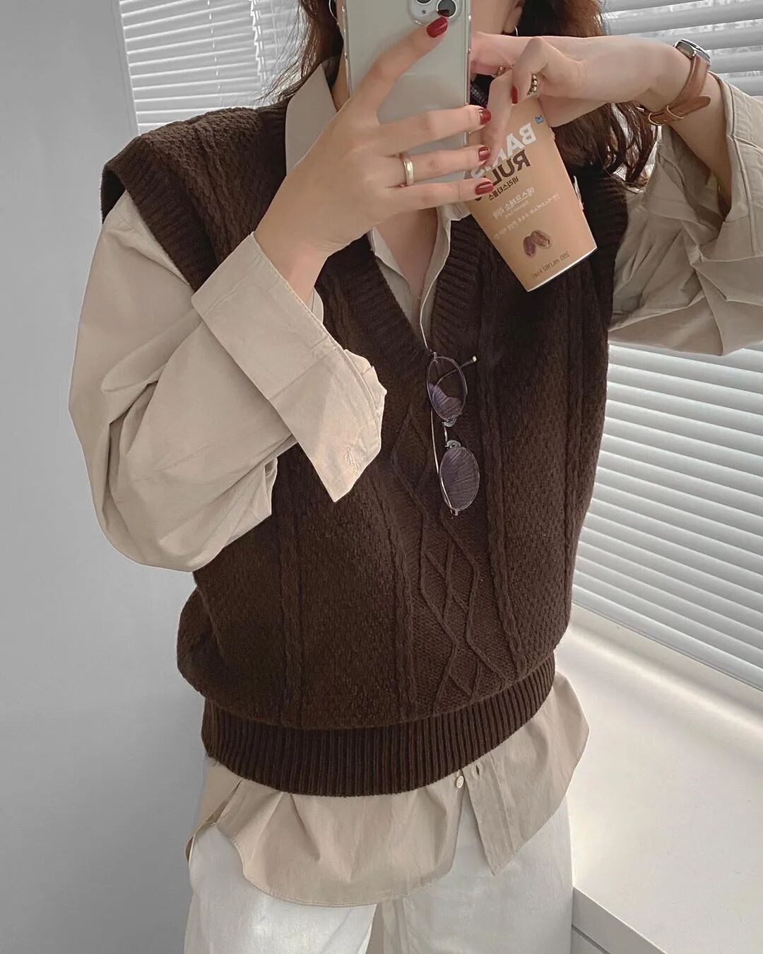 这套穿搭的出彩之处不在衬衣,而在背心,喜欢这样穿的妹子,一定要多选几件好看的马甲,换着穿。