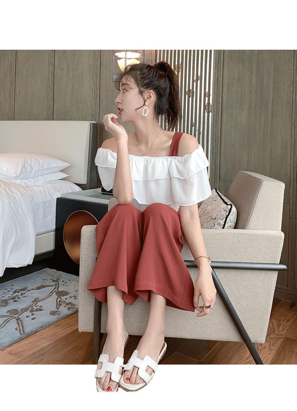 这款带有双荷叶边的一字领上衣巧妙地遮住大粗臂