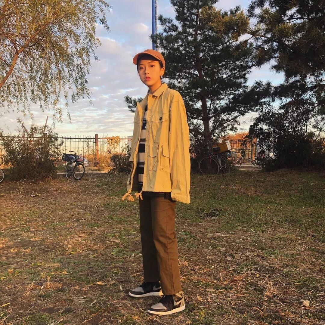 搭配理由:这身搭配以卡其色、黑灰色为主。选择卡其色但饱和度不同的帽子、外套、休闲裤,搭配黑白条纹长袖与黑灰影子,显得休闲、帅气。日常搭配中,选好一身搭配的颜色基调也很重要。
