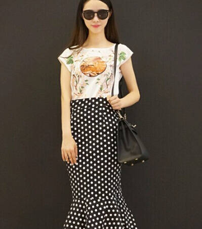 波点半身长裙,版型真是非常赞,美人鱼般的修身版型设计,完美凸显臀部和腿部的线条,妩媚至极,很有气质,有时候时尚就是这么简单。
