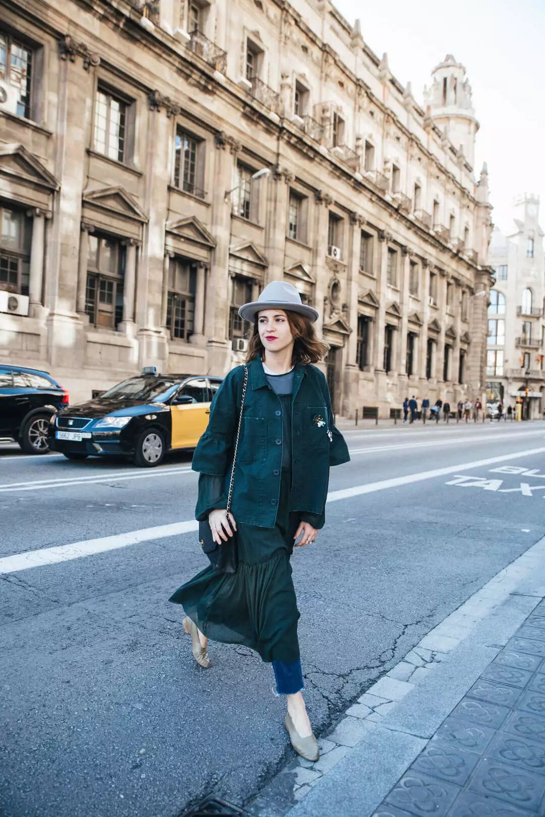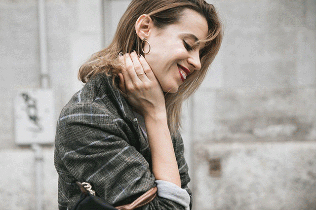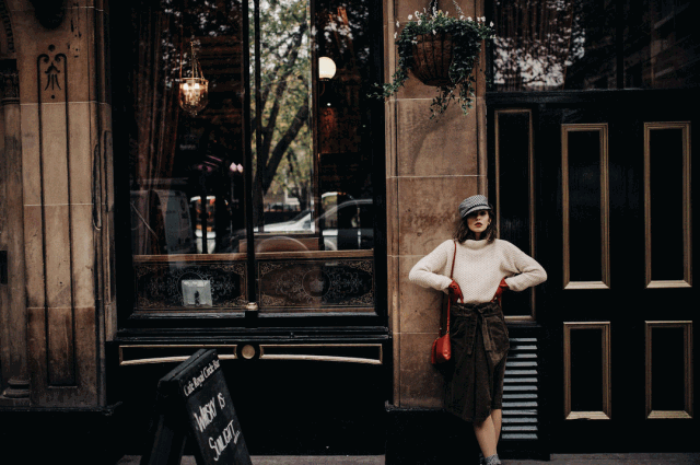 同色系的搭配还有一个小技巧,就是用跳色来制造画面亮点,不至于让人融进背景。所以千万别忘记带一个亮眼的小配饰。▼