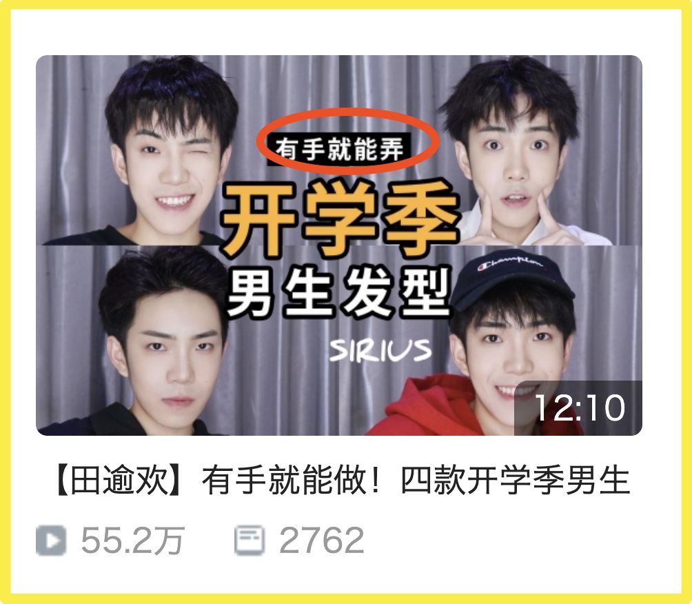 UP主,他会在开学伊始适时发布四款得体精致的男生发型,让直男改造从“头”开始,也甭搞那么多复杂的吹风筒夹发棒,直打口号——有手就能做。