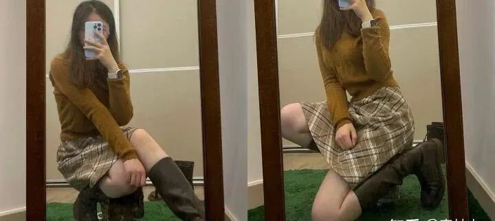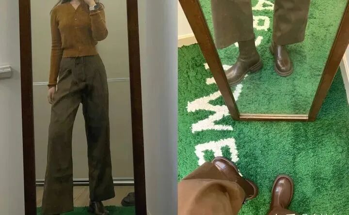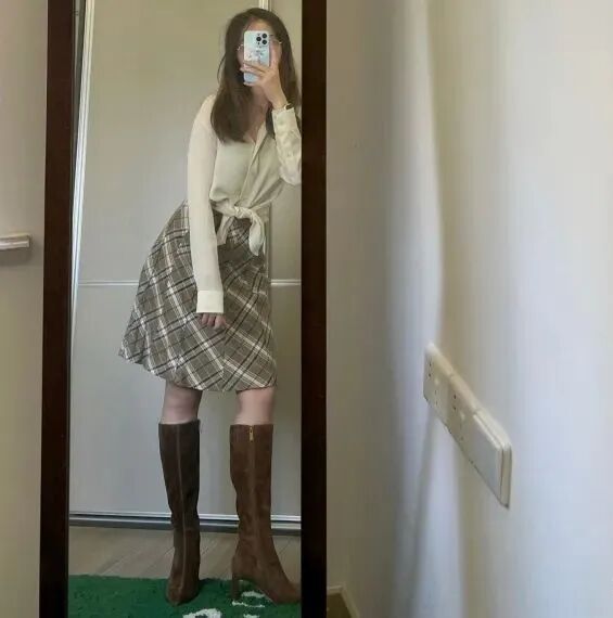 搭配:棕色、栗色系毛衣➕复古半裙➕马丁短靴。