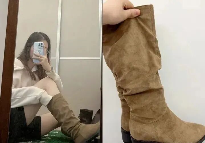 我这双哈森的绒皮及膝靴的舒适度非常高,包裹性服帖性很好。外面搭配大衣,里面裙子或者紧身裤,能够在视觉上至少提高5-10厘米的身高,特别适合腿细但是腿短、胯宽腿不直的女生。