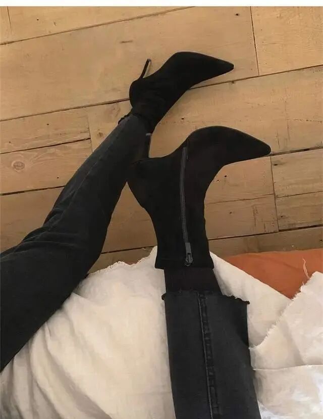 尖头靴一直都是性感的代名词,尖头靴有着强烈的个性,纤巧精致,穿着尖头靴感觉一双脚都变得修长,脚背漂亮地弓起来,很容易让整个人变得气场很强大。秋冬的造型大都很厚重,尖头靴可以营造一种轻盈俏丽的感觉。