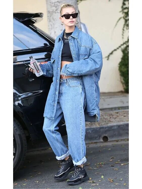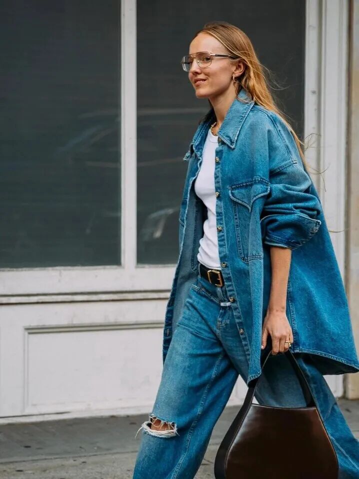 身材骨感高挑的姐妹,在挑选牛仔褂和牛仔裤时可以优先考虑宽松肥大的廓形牛仔褂和阔腿牛仔裤,博主身上这类松垮有型、慵懒又非常有格调、有辨识度的造型就值得大家学习借鉴,撑不满衣身的效果把牛仔单品的潇洒随性展示得淋漓尽致。
