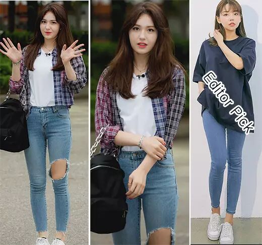 在参加某音乐节目的拍摄而亮相的她,在条纹中性衬衫内搭配了一件白色T恤,又将白T恤掖进膝盖处有破洞处理的牛仔裤中,将休闲之风发挥得淋漓尽致。这种搭配看似无心,却饱含细节亮点。