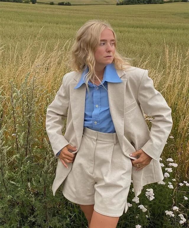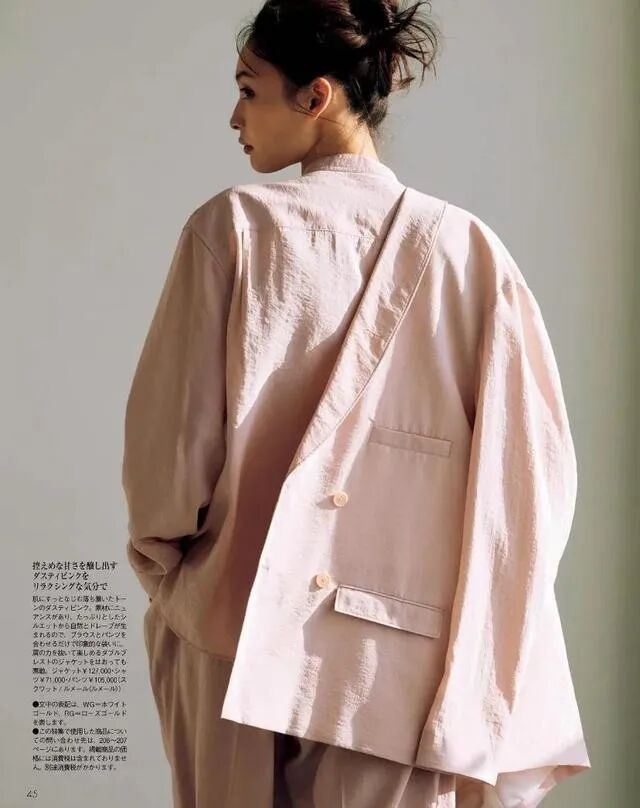 至于成熟女性而言,对于粉色还是比较执着的,但是粉色的饱和度一定要选择的很好,选择同色系的搭配能够降低颜色的驾驭难度,粉色的衬衫搭配粉色的西装外套,相同的颜色,给人一种远离世俗超脱的感觉,而且这种棉麻材质有一种文艺风格,完全诠释出了一种复古的风范。