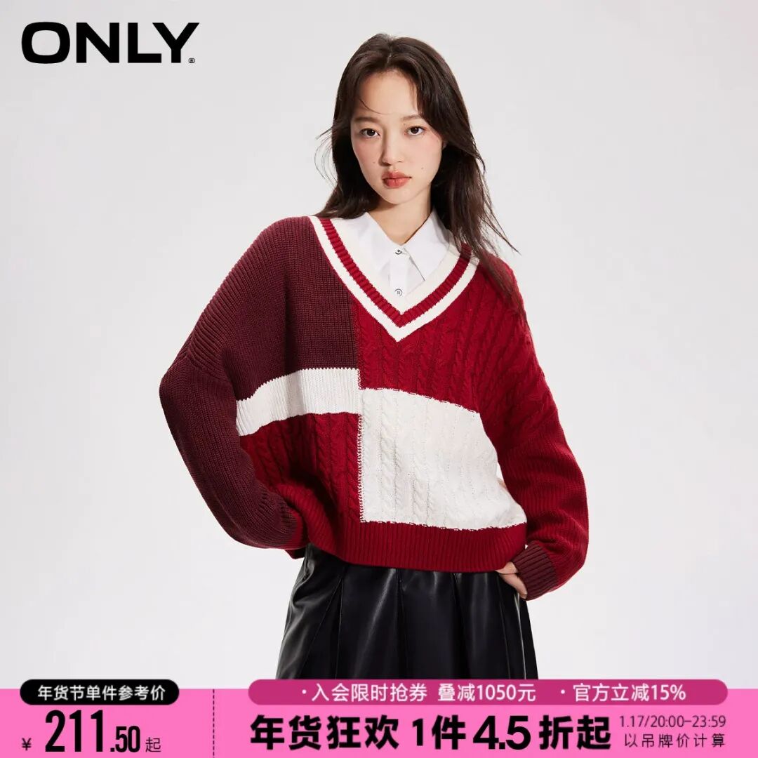 【红毛衣】ONLY2023冬季新款时尚撞色落肩宽松长袖V领针织衫女