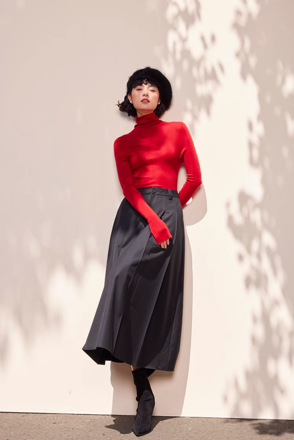 6、红毛衣+黑色半身裙+尖头鞋